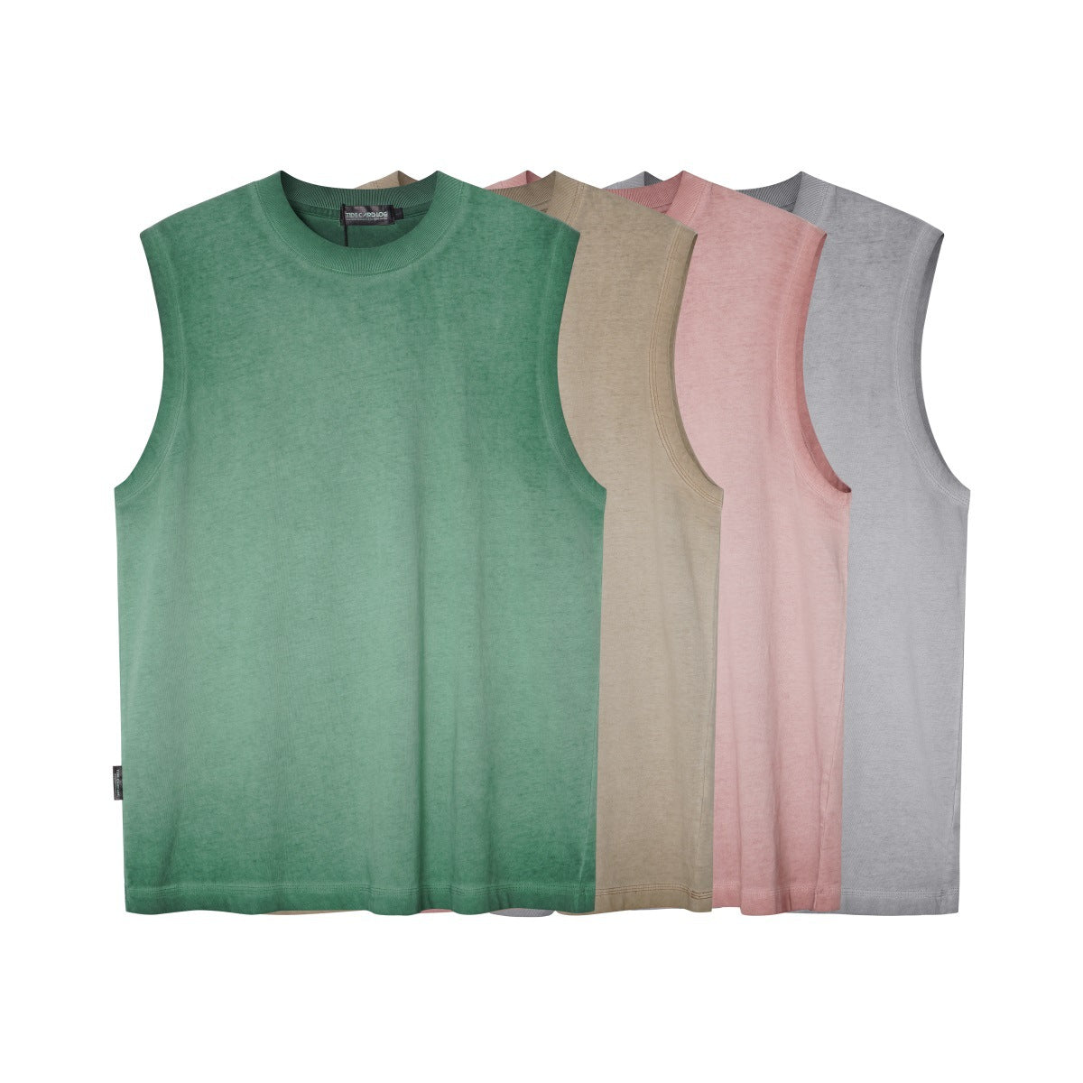ヴィンテージ感漂うカラーリングと、ゆったりシルエットが魅力のスリーブレストップス。